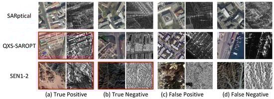 We conduct experiments on three SAR-optical image datasets: SARptical [], QXS-SAROPT [], SEN1-2 []. SARptical is a dataset of over 10,000 pairs of corresponding SAR and optical image pairs, which are from TerraSAR-X and aerial UltraCAM optical images. The images are of pixels with 100 m × 100 m ground coverage. We use 7577 image pairs for training and 1263 patch pairs for testing. QXS-SAROPT contains 20,000 pairs of SAR-optical image patches from GaoFen-3 satellite and Google Earth, covering a variety of land types. The images have a size of pixels at a pixel spacing of 1 m × 1 m. The dataset is randomly divided into training and testing at a ratio of 7:3. We select the spring subset from four sub-groups in SEN1-2 dataset, which consists of registered patch-pairs from Sentinel-2 and Sentinel-1—a total of 75,724 patch pairs of size pixels with spatial distance of 10 m × 10 m, of which 52,799 are for training and 22,925 for testing.