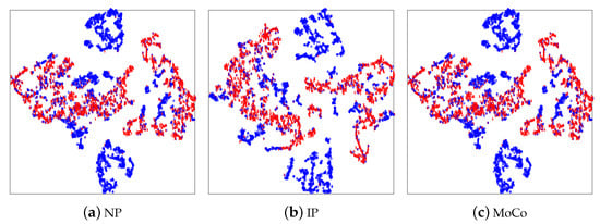 Visualization of positive and negative features extracted by BNN with NP, IP, and MoCo pre-training using t-SNE. The red dots represent the positive features, and the blue dots represent the negative features.