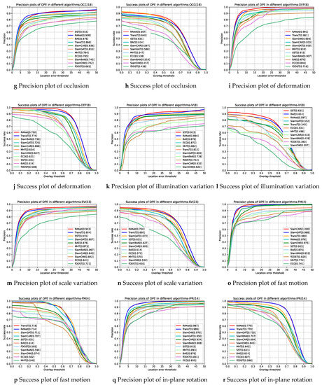 where G indicates the groundtruth box and A is the predicted bounding box. The symbol of represents the number of pixels in the area. Success rate represents the ratio of successful frames to total frames in a series of frames. The success plot shows the success rate trends when the threshold changes from 0 to 1 at an interval of 0.02. The area under the curve (AUC) of each success rate curve is used to rank the success performance of the tracker.