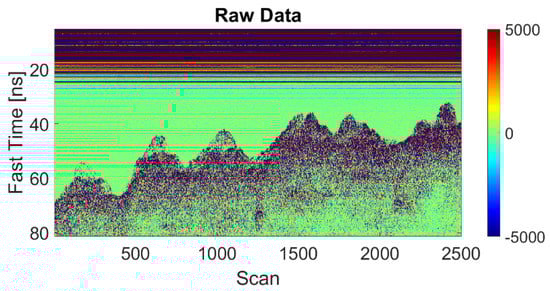 The effect of direct coupling can be clearly distinguished from the air–ground interface when the UAV’s flight height above the ground is large in terms of the probing radar wavelength (e.g., see raw data collected by System 8 in Figure 7). In these cases, direct coupling does not mask the signal backscattered from shallowly buried targets and it can be easily removed from the raw data by filtering procedures, such as background removal and/or time gating [,,]. As is well known, background removal replaces the current trace (A-scan) with the difference between it and the average value of all A-scans (or a subset of A-scans close to the trace of interest) in the radargram (B-scan). However, background removal also acts on the signal scattered by the target; thus, further ground compensation procedures are required to restore the point spread function (PSF) of the system []. On the other hand, time gating selects the time interval containing the signals scattered from targets of interest and sets the signal outside such interval to zero. Figure 8 shows the effect of applying the time-gating procedure to raw data displayed in Figure 7.