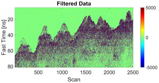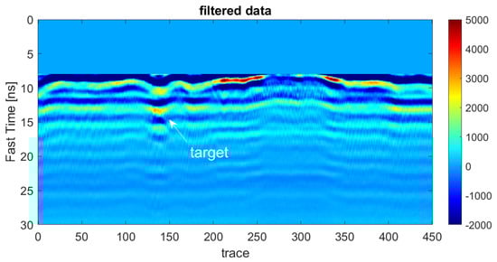 Figure 16 shows the filtered radargram achieved after the application of the time-gating operation, which sets the signals outside the time interval of 8–30 ns to zero. Now, the air–soil interface and the target anomaly are better emphasized compared to their counterparts in the raw radargram (see Figure 15).