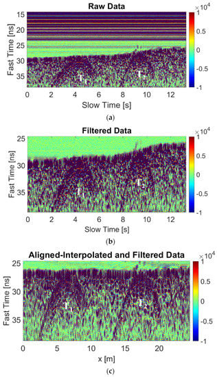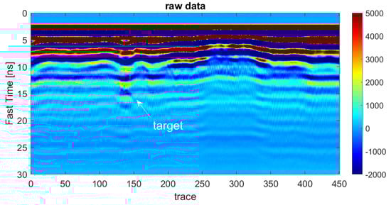 The raw radargram collected by the system is depicted in Figure 15 where the horizontal axis is the trace index, while the vertical axis is the fast time. The raw radargram shows strong horizontal constant signals linked to the Tx-Rx antenna coupling. Despite this large clutter contribution, the radar also reveals the presence of some subsurface layers in the fast time window of 10–25 ns. Moreover, a weakly scattering anomaly associated with the buried metal plate appears around the trace 140 at the fast time of 14 ns.