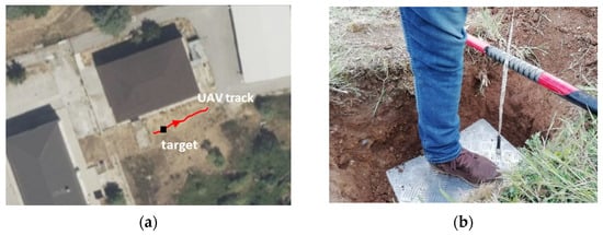 The field trial was carried out on the 12 May 2022 over an open area in close proximity of the Hydrogeosite laboratory of IMAA-CNR, located in Marsico Nuovo, a small town in Basilicata, Italy. Figure 14a shows the aerial view of the site provided by the Zoom Earth web application [] with the UAV flight trajectory (red line) and the superimposed target (black rectangle). Figure 14b shows a photo of the metal plate taken during the burial operation. The main radar system parameters adopted for the data acquisition are described in Table 4.