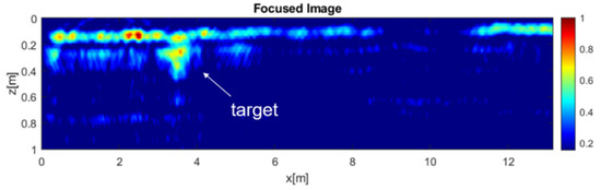 Figure 17 shows the focused image of the surveyed area. This image was obtained by considering a rectangular investigation domain with a size of 13.6 m × 1 m, whose x axis and z axis correspond to the along-track direction and depth, respectively. The domain was evenly discretized in square pixels with size of 0.02 m × 0.02 m. As can be seen, the focused image can clearly identify the shallow soil stratigraphy as well as the target that appears to be located at a depth around 0.3 m. Despite the simple proof-of-concept example, the achieved result demonstrates the potential of the considered UAV-GPR system to detect buried objects.