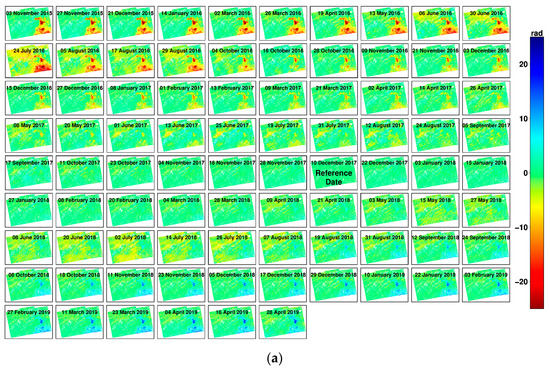 (a) Unwrapped phase time series for ascending track 142 after atmospheric correction. (b) Unwrapped phase time series for descending track 47 after atmospheric correction.