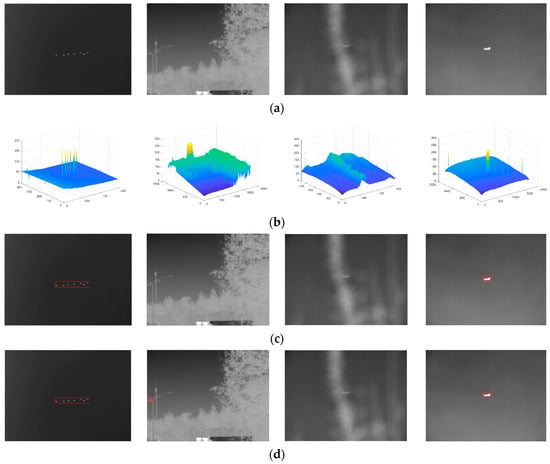 Some infrared images in our infrared small-target OEDD. (a) Large and medium aircraft; (b) small aircraft; (c) floating ball; (d) birds.
