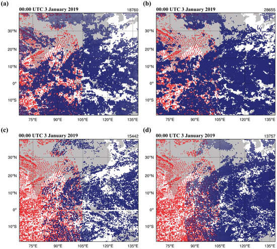 Examples of the horizontal distributions of all IR and WV channel’s AMVs data coverage plots over the research domain derived from (a) FY-2G, (b) FY-4A, (c) HIMA-8 derived from CIMSS, and (d) HIMA-8 derived from NCEP PREBUFR file, plots in dark blue dots which were valid at 00:00 UTC on 3 January 2019. The red triangle dots denote the Meteosat-8′s AMVs, which also cover the western part of the domain. Topography is indicated by the grey colour.