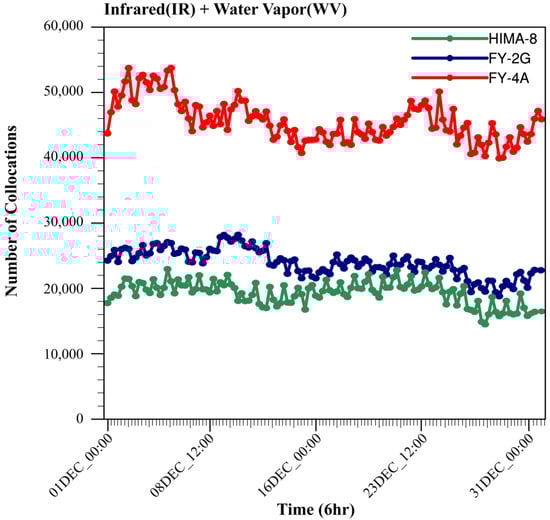 HIMA-8 in the east, and FY-2G and FY-4A satellites covering the entire area represent the typical spatial AMVs data coverage for Southeast Asia and the adjacent waters. The horizontal distribution of the IR and WV channel’s AMVs data from all available satellites encompasses the research region shown in Figure 1. In comparison to two versions of the HIMA-8 (Figure 1c,d), the IR and WV AMVs obtained from the FY-2G and FY-4A (Figure 1a,b) provided wind vectors more evenly distributed over the research domain (dark blue dot). The Indian Ocean, where HIMA-8 AMVs are scarce, is additionally served by FY-2G and FY-4A AMVs. For the two versions of HIMA-8, the observable quantities were 13,754 to 15,442, 18,760 for the FY-2G AMVs and 28,655 for the FY-4A AMVs, respectively. It was demonstrated that the horizontal distribution of the FY series from all channels may be used to complement AMV data in areas where the HIMA-8 AMVs are not present. Figure 2 depicts the time series of the IR and WV AMV observation amounts for the research region in December 2018. The quantities of AMVs from the three satellites were consistently observed, and the number of collocations of the FY-4A was substantially larger at a particular time than the quantities of the FY-2G and HIMA-8.