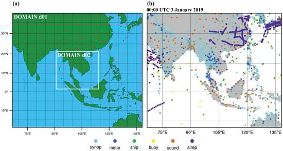 (a) Experimental domain for two nested domains used in WRF model simulations. Spatial resolutions are 12 and 4 km for domains 01 and 02, respectively. (b) Example of the locations and the distribution of conventional observations used valid at 00:00 UTC 3 January 2019.