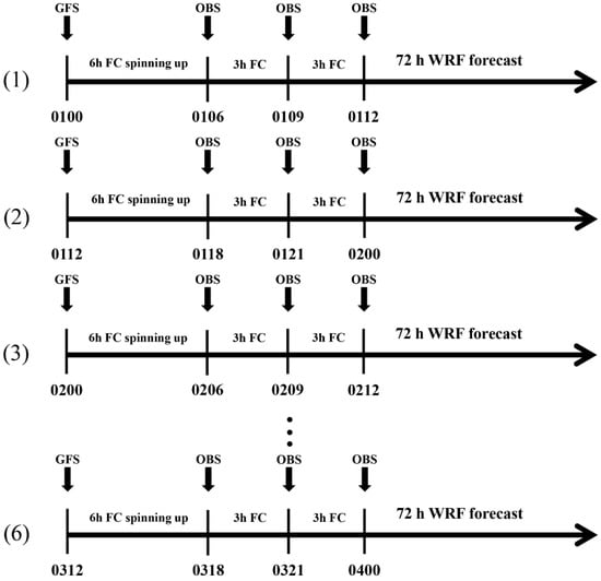 Figure 4 depicts the flow charts of the partially cycling experiments conducted for this study. A total of six partially cycling analysis and forecast runs were performed at a frequency of 12 h for four experiments (CONV, FY2G, FY4A, and HIM8) from 06:00 UTC 1 January 2019 to 18:00 UTC 3 January 2019. With the NCEP GFS analysis as the background, each partially cycling run commenced with the first analysis 6 h earlier than the initial conditions times. Subsequently, three hourly analysis updates were obtained using a 3 h forecast initialized from the preceding cycle’s analysis as the background. Following the completion of three hourly cycle runs, 72 h forecasts were generated and gathered at 6 h intervals to assess the impact of the AMVs. The NCEP GFS analysis gave the lateral boundary conditions for 3 h and 72 h predictions.