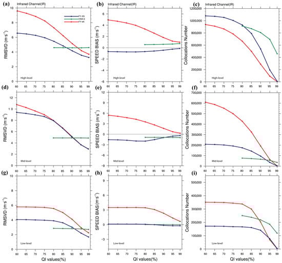The mean RMSVD (a,d,g), BIAS (b,e,h), and numbers of collocations (c,f,i) of IR AMVs for different levels from high, mid, and low-levels using variable QI values from 60 to 100% in December 2018.