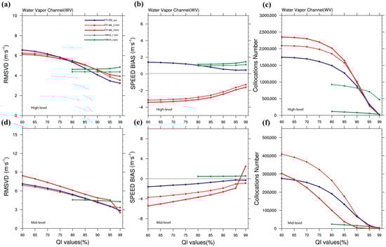 The mean RMSVD (a,d), BIAS (b,e), and numbers of collocations (c,f) of WV AMVs for different levels from high, and mid-levels using variable QI values from 60 to 100% in December 2018. The WV AMVs data was not available for a low-level.