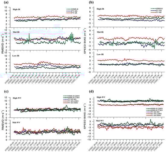 Figure 7 depicts the time series of the RMSVD and BIAS at QI 85% of the FY-2G, FY-4A, and HIMA-8 infrared and water vapour AMVs at high, mid, and low-levels, averaged over the research domain taken four times a day in December 2018. In the case of infrared AMVs, the RMSVD from the HIMA-8 AMVs was somewhat better at all levels than the other two sets (Figure 7a). For the FY-4A, the RMSVD was higher in high and low-levels than in the FY-2G and HIMA-8 for the individual 6 h time-period. The FY-2G and HIMA-8 had comparable BIAS properties (Figure 7b), whereas the FY-4A had positive values and a greater error. In the case of water vapour AMVs, the RMSVD of all three versions was similar in nature with a few exceptions (Figure 7c). The BIAS of FY-2G and HIMA-8 were comparable (e.g., positive speed bias), whereas the BIAS of the FY-4A showed a negative speed bias at high and mid-levels (Figure 7d).