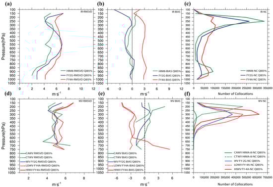 Comparisons of the vertical profile in December 2018 of the three sets of AMVs at QI 85% from FY-2G, FY-4A, and HIMA-8 IR AMVs for (a) the RMSVD, (b) the BIAS, (c) the numbers of collocations while WV AMVs for (d) the RMSVD, (e) the BIAS and (f) the numbers of collocations.