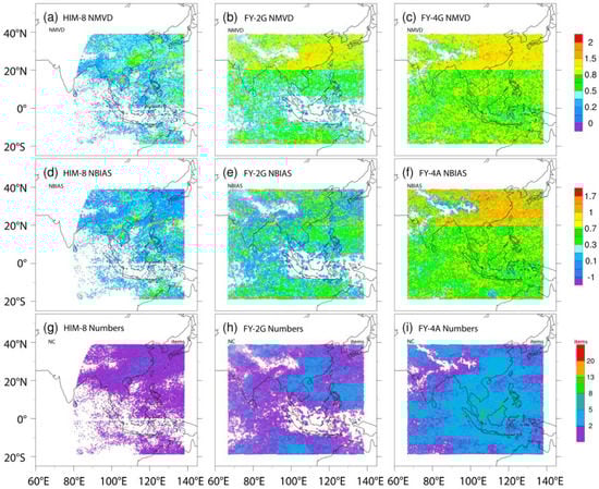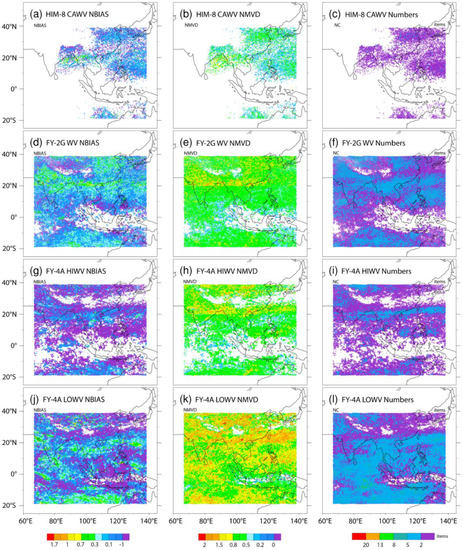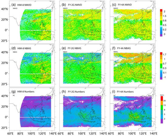 where  is the quantity of AMVs used to analyse the data,  and  are the zonal and meridional wind components of the AMVs, and  and  are the zonal and meridional components of the NCEP FNL analyses of wind, respectively. BIAS denotes the differences in wind speed between the AMV observations and the first-guess field, while RMSVD indicates their differences which constitute both the speed and direction together. The AMVs were verified using data obtained between November 2018 and January 2019. In order to compare all three versions of the IR and WV AMVs (FY-2G, FY-4A, and HIMA-8) in horizontal distributions, the corresponding normalised parameters with respect to the mean of the reference NCEP FNL wind analyses, estimating the normalized mean vector differences (NMVD) is expressed as: