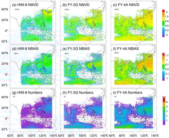 For the mid-level, the NMVD (Figure 10a–c) and NBIAS (Figure 10d–f) for all three sets of AMVs were also similar, as shown at the high-level. Nonetheless, relative to the HIMA-8 and FY-2G, the FY-4A had a greater number of collocations (Figure 10i), with the NMVD (Figure 10c) and NBIAS (Figure 10f) significantly higher in both the tropic and extra-tropic regions. Similarly, it was demonstrated in the mid-level, as for the low-level (Figure 11). The pattern of the NMVD (Figure 11a–c) and NBIAS (Figure 11d–f) of AMVs from three satellites at low-level has similar characteristics. The total collocation in FY-4A is much higher compared to FY-2G and HIMA-8 (Figure 11g–i). However, the HIMA-8 AMVs still have better NMVD, slightly smaller NBIAS compared to other two sets especially in the extra-tropics region.