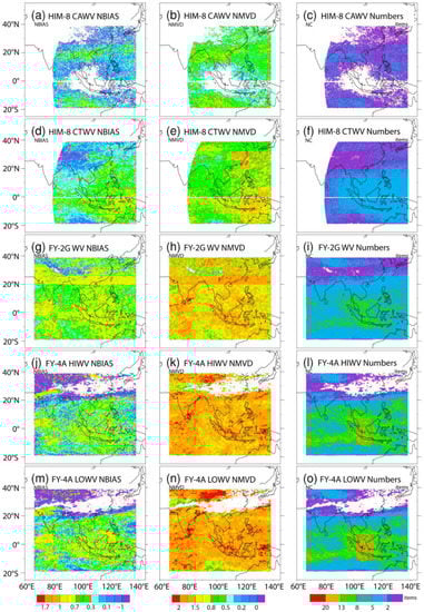 When IR and WV AMVs from the FY-2G, FY-4A, and HIMA-8 AMVs were collocated with NCEP FNL wind analysis in December 2018, the spatial pattern plots of NMVD and NBIAS were compared on average, including that of the number of collocations. For the IR AMVs, the NMVD for all three sets of IR AMVs was consistent at the high-level (Figure 9a–c); however, compared to the other two sets, the FY-4A AMVs had fewer collocations at higher latitudes (Figure 9i), were predominantly located in the tropics, and had slightly larger NMVD values, notably in the extra-tropics. When compared to the FY-4A AMVs, the HIMA-8 and FY-2G AMVs exhibited a greater and more uniform distribution of collocation numbers (Figure 9g,h). The NBIAS pattern for the FY-2G and HIMA-8 of the IR AMVs (Figure 9d–f) were comparable with few exceptions. In the tropics, the NBIAS from the FY-2G and HIMA-8 were positive, while in the extra-tropics, they were negative (Figure 9d,e); however, the NBIAS for the FY4A had more positive values than the other two sets in both the tropics and extra-tropics (Figure 9f).