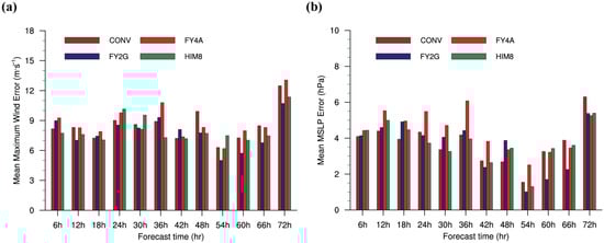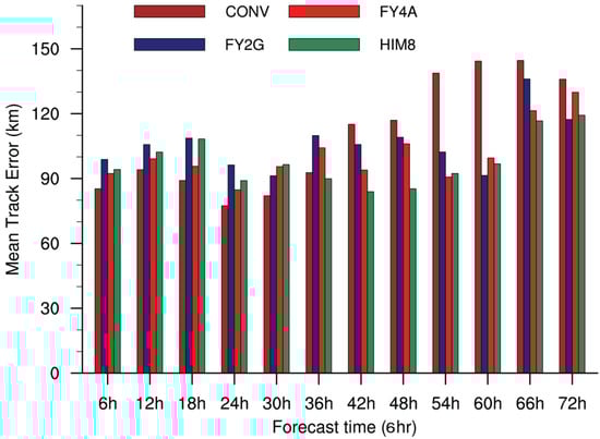 Figure 15 depicts the average track errors for each 6 h forecast from all four sets of experiments. It is noted that in all the AMVs experiments (e.g., FY2G, FY4A, and HIM8), the impact of AMVs was mostly positive between the 42 h and 72 h forecast lead times as compared to the CONV. The 42 h prediction track errors in the FY2G, FY4A, and HIM8 were 105.7, 93.9, and 83.9 km, respectively, whereas the error in the CONV was 115.1 km. The relative track forecast errors computed with respect to the CONV for the FY2G, FY4A, and HIM8 experiments were −8.1%, −18.4%, and −27.1%, respectively. The highest relative reduction occurred for the 60 h (36.6%) forecast for the FY2G, the 54 h (33.4%) forecast for the FY4A, and the 54 h (33.4%) forecast for the HIM8 experiment, respectively.