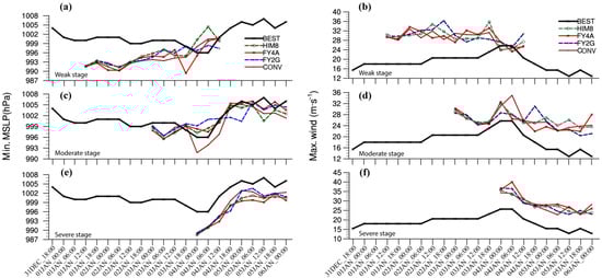 The temporal distribution of the minimum MSLP and maximum surface winds from the CONV, FY2G, FY4A, and HIM8 experiments for TC PABUK is given in Figure 16. The prediction of TC intensity began at 12:00 UTC 1 January 2019 (Figure 16a) at its weak stage. The predicted MSLP was over-estimated in all experiments. The simulated maximum surface wind speed from each experiment was similar and relatively strong compared to the BEST (Figure 16b). During its moderate stage, which began at 00:00 UTC on 3 January 2019 (Figure 16c), the predicted minimum MSLP matched the BEST well during the whole integrated period. The FY4A and HIM8 tended to correct the minimum MSLP when the integrated time was up to 24 h to 36 h compared to the CONV and FY2G; however, the maximum surface wind speed from all experiments also provided much stronger values, at a peak duration varying between 25.8 to 35.1 m/s, comparable to the peaked BEST (Figure 16d). At its severe stage, which began at 00:00 UTC on 4 January 2019, the minimum MSLP and maximum surface wind were over-estimated in all experiments (Figure 16e,f).
