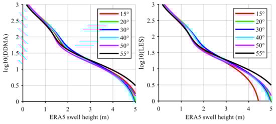 GMFs constructed by DDMA (top left), LES (top right), and TES (bottom) in log10 scale with ERA5 swell height product at incidence angle bins of 15°, 20°, 30°, 40°, 50°, and 55°. Using ERA5 swell height as the ground truth swell height.