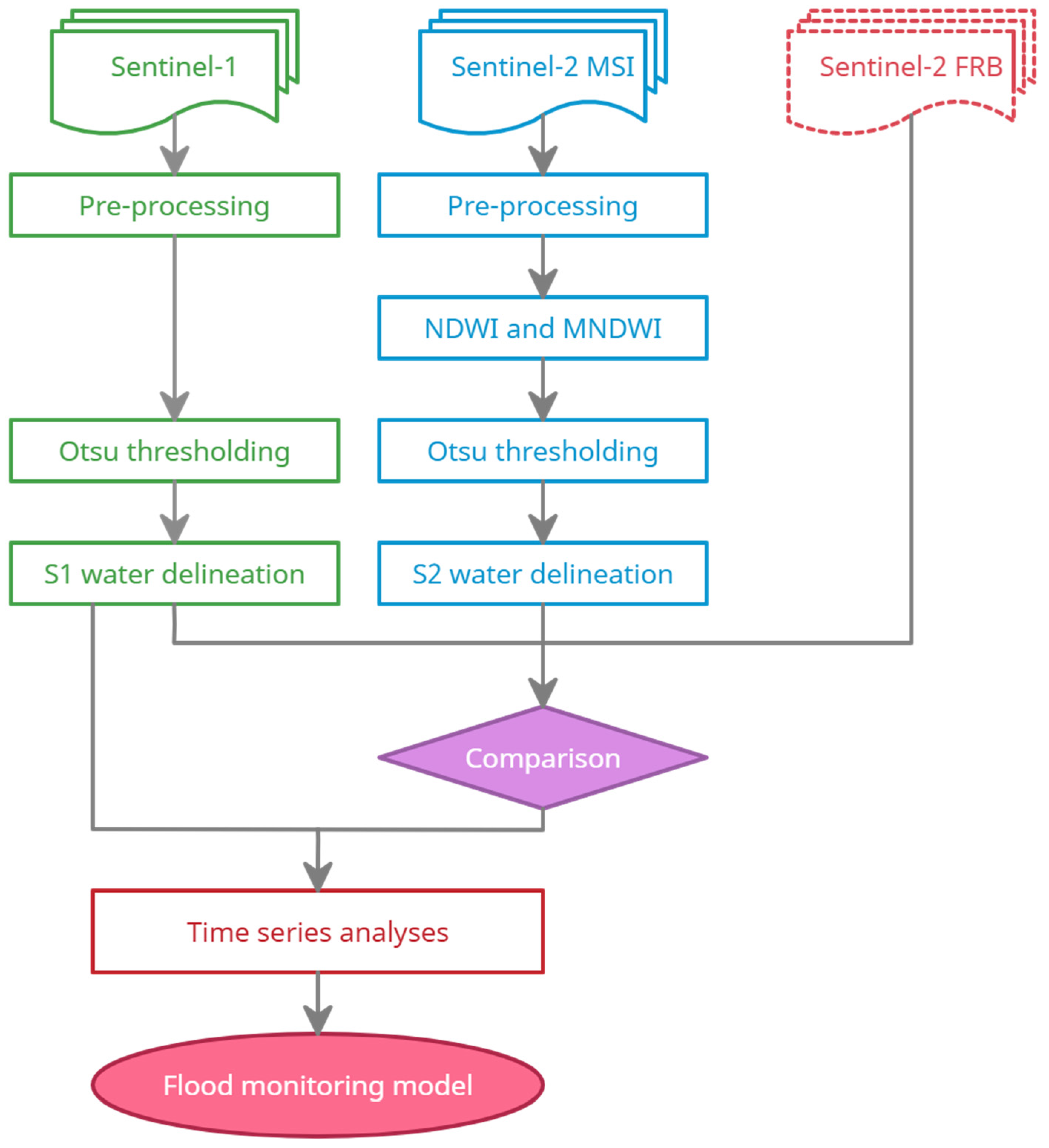 Figure 3 shows the flowchart of surface water mapping and flood monitoring using the Sentinel-1 image time series. Green section, Sentinel-1 images are pre-processed and then applied the automatic Otsu thresholding algorithm for water delineation. Blue section, Sentinel-2 MSI images are first pre-processed to generate normalized difference water index (NDWI) and modified normalized difference water index (MNDWI) products. The automatic Otsu threshold is then applied similarly on the derived NDWI and MNDWI products for water delineation. Next, a comparison between surface water maps derived from Sentinel-1 SAR data, optical Sentinel-2 MSI data, and Sentinel-2 FRB images is performed to estimate the ability to apply the Otsu thresholding algorithm on Sentinel-1 SAR data for mapping surface water. Finally, a flood mapping algorithm is developed for monitoring flood water extent in NRT using a sequence of time series analyses based on the change detection approach.