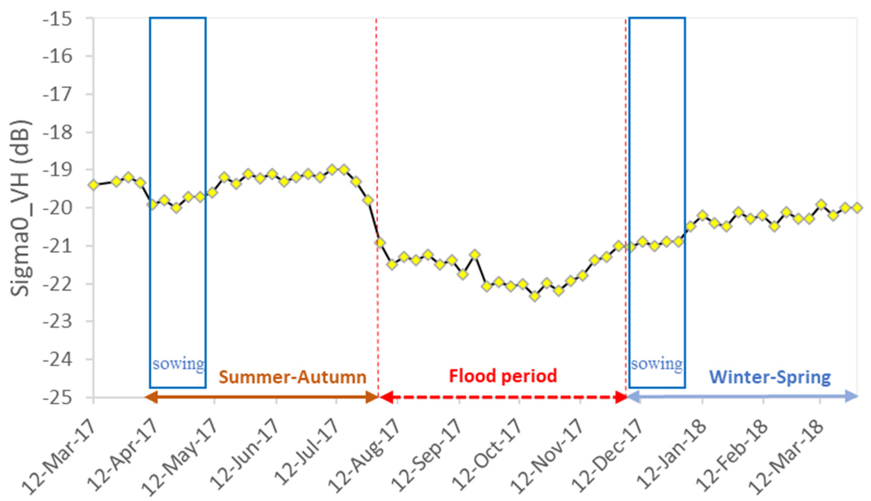 Sentinel-1 backscatter of crop phenology at two random samples, DR1 (10.47°N and 105.17°E) and DR2 (10.63°N and 105.51°E), cultivating two rice seasons a year (summer-autumn and autumn-winter seasons). The summer-autumn rice season is from April to July (right before the flood). The winter-spring rice season begins from December (right after the flood) to March. Another rice season could be possible in the flooding period from August to November for the areas that are protected by the dike system (autumn-winter season).