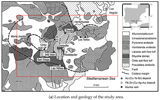- Arribas, A.; Cunningham, C.; Rytuba, J.; Rye, R.; Kelly, W.; Podwysocki, M.; McKee, E.; Tosdal, R. Geology, geochronology, fluid inclusions, and isotope geochemistry of the Rodalquilar gold alunite deposit, Spain. Econ. Geol. 1995, 90, 795–822. [Google Scholar] [CrossRef]