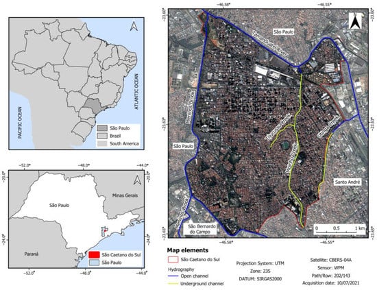 To the north, the city is bordered by the Tamanduateí River, and to the west and south, by the Meninos Brook, both canalized. The hydrographic network is also composed by Utinga, Tijucussu, and Moinho Creeks, and the latter one is channeled under an avenue. The micro drainage system contains six micro-watersheds, differentiated from each other according to the topography and the installed storm water drainage network []. At the macro drainage scale, the municipality is contained within the Billings-Tamanduateí sub-basin, which is part of the Alto Tietê River watershed, characterized by an intense urbanization process [].