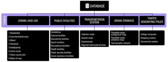 Considering that land use change occurs at each time step of the simulation, the distances to these land uses have to be accordingly recalculated at each time step, and thus, these variables are called dynamic. Such dynamic variables are internally generated by the modeling platform and are transparent to the user. The latest four themes include sets of static driving variables for land use change, which are those that remain constant throughout the simulation run. The public facilities concern education, culture, leisure, health services, and alike. In its turn, the “transportation system” comprises the regional intermodal terminal and the city′s main roads, differentiated into collector roads, arterial roads, and expressways. For the “urban drainage” theme, data on hydrographic network and floodable areas were considered since floods are a recurrent problem in the analyzed city. Finally, the “traffic generating poles” involve commercial centers, shopping centers, and university campuses. Figure 2 shows the database structure.