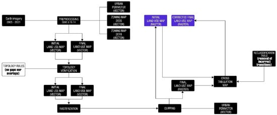 All land use maps were clipped with a mask corresponding to the city boundary. Cross-tabulation operations were performed between the 2006 and 2018 as well as between the 2018 and 2021 land use maps, aiming to remove incorrect transitions by means of reclassification tables directly assigned to the cross-tabulation maps (Figure 4). These spurious transitions occur in the form of isolated pixels or small sets of pixels that appear in the generated cross-tabulation maps as a result of undesirable errors arisen during the vector–raster conversion processes. In total, 16 land use transitions were identified in the first simulation period (2006–2018) and five transitions in the second one (2018–2021). They are indicated in Table 1, which also shows the respective numerical codes for the eight land use classes.