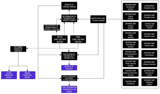 JIU varies from 0 to 1, and these values are associated with complete independence and total dependence, respectively. The threshold for independence has been empirically set as less than 0.5 [], which indicates less association rather than more. Whenever JIU surpasses 0.5, one of the variables of the pairwise test must be discarded from the model, since the Bayesian weights of evidence method relies on the assumption of independence between variables, as previously exposed. In such cases, we preferably discard the one with less explanatory power for the land use change at issue. Figure 7 shows the flowchart for the parameterization stage.