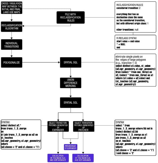 Due to the polygonalization, the resulting vector files present in most cases isolated pixels on the edges of large polygons. This flaw compromises the calculation of the land use transition patches and must be corrected by employing a spatial query. This procedure was performed for each transition in Terra View using Spatial SQL. Once identified and exported in shapefile format, these files were submitted to simple map algebra operations. First, isolated pixels are united with their respective larger neighboring polygons. The original problematic polygons are subtracted from the vector layers, and lastly, the newly generated polygons are then merged to the vector files resulting from the subtraction operation. Thus, the resulting layers are error-free vector files where isolated pixels detached from larger neighboring polygons are no longer found. Such files were exported to QGIS, where new Spatial SQL routines were implemented for calculating the percentage of patches accomplished by the “expander” change allocation algorithm as well as the mean size and the size variance of patches generated by the “expander” and the “patcher” algorithms. Since these two change allocation functions are complementary, i.e., the sum of their percentages total 1.0, the Dinamica EGO platform only requires as input data the percentage of “expander”, and the residual transitions that were not achieved by “expander” are automatically transferred to the “patcher” function [,]. Figure 8 shows the flowchart of the reported procedures.