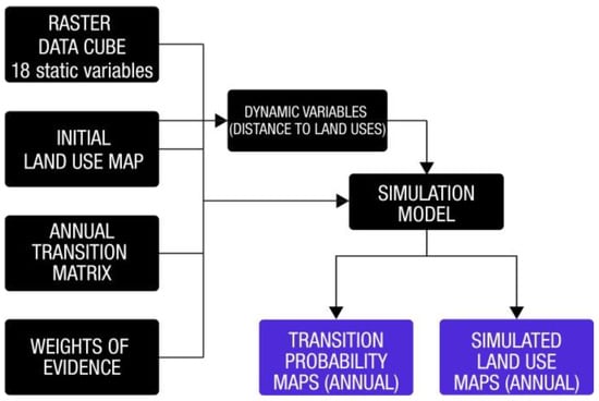 This step was developed in Dinamica EGO 6.0 and consisted in determining the global and annual transition matrices, i.e., transition rates for the whole simulation period and decomposed in yearly time steps, respectively, as well as defining the positive weights of evidence for all input variables (static and dynamic ones). The calculation of the annual transition matrices for both simulation periods was based on the Markov model, according to Equation (1) [].
