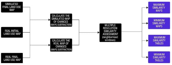 The validation employed in this research adopted windows of size 3 × 3, 5 × 5, 7 × 7, 9 × 9, and 11 × 11 pixels. The masking operation was achieved by subtracting the initial land use map from both the final real and the final simulated land use maps, and these resulting maps of difference, exclusively indicating areas of changes, were then reciprocally compared with each other. The FSI is evaluated based on a correspondence between the values obtained for the constant and exponential decay. If, for instance, a constant decay maximum value of around 0.80 is obtained for a 3 × 3 window, and an exponential decay maximum value of nearly 0.3 is achieved for the same window size, then 0.3 is regarded as a satisfactory agreement with respect to the 3 × 3 pixels resolution for the exponential decay. Figure 10 illustrates the flowchart of the validation process.