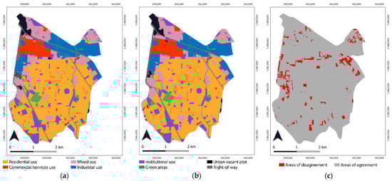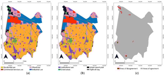 (a) 2018 simulated land use map with refined calibration, (b) 2018 real land use map, (c) areas of agreement and disagreement.