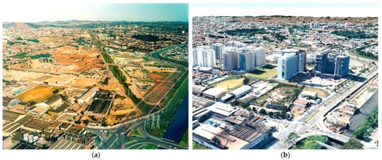 (a) Aerial photo of the former ceramic industry site in 1998, with the intersecting power transmission line, (b) aerial view of this site nowadays, with the residential and office towers and the rounded mall building in the back. The relocated transmission line contours the site. Sources: [,].