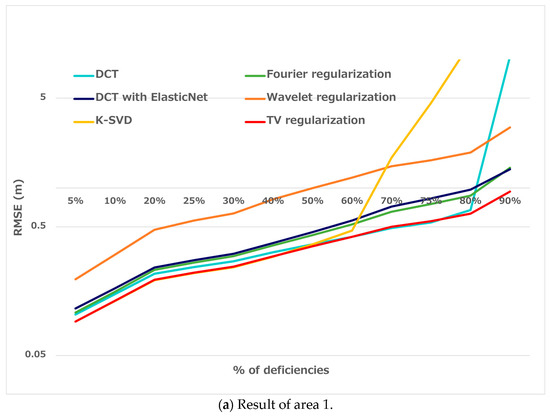 Figure 8 and Figure 9 show the application results. In the case of random deficiencies, the K-SVD method was effective when the percentage of deficiencies was under 50%. The DCT method was effective when the percentage was 50–75%, and the TV minimization method was effective when the percentage was 80% or more. Regarding the correlated deficiencies, the K-SVD and TV minimization methods were effective when the percentage of deficiencies was 75% or less. In comparison, the TV minimization method was effective when the percentage of deficiencies was 80% or more. The DCT and K-SVD methods had good accuracy when the percentage of deficiencies was low. Both methods used local features in the DEM, resulting in significant accuracy degradation when the percentage of deficiencies was high (80% and 60%, respectively). On the other hand, the DCT with elastic net method did not show the above significant accuracy degradation because it relaxed the constraint condition by using L2 regularization. Compressed sensing, which deals with the frequency space of the entire DEM, did not show outstanding accuracy compared to the other methods. Comparison with the sparse coding results indicates that local features, rather than the entire DEM, are significant for terrain restoration. The TV method, on the other hand, considered local DEM gradients in the entire DEM, resulting in a higher overall accuracy. The effectiveness of each method did not differ depending on the topographic shape.