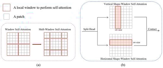 (a) Window self-attention. The window self-attention mechanism divides the input feature map into multiple windows within which self-attention is computed. Information interaction across windows is achieved using shifted-window. (b) Cross-shaped window self-attention. The cross-shaped self-attention mechanism divides the feature map into vertical and horizontal branches, adjusts the size of the strip window according to  on both branches, and calculates the self-attention within the strip window. Finally, the attention results are fused in both directions.