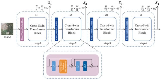 We embed the cross-shaped window self-attention into the module, forming a cross-Swin Transformer block. We stack N cross-Swin Transformer blocks in the 4 stages of the backbone network, where the values of N are 1, 2, 21, and 1. The improved network structure is shown in Figure 3. In the cross-shaped Swin Transformer backbone, we set C to 64. The computational complexity of cross-shaped window self-attention can be expressed as