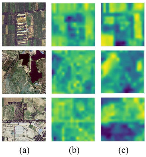 The visual effects of the semantic space optimization module. The optimized feature information is more obvious, and both interclass differences and intraclass similarities are significantly optimized. (a) Input image. (b) Original semantic-space. (c) Optimized semantic-space.