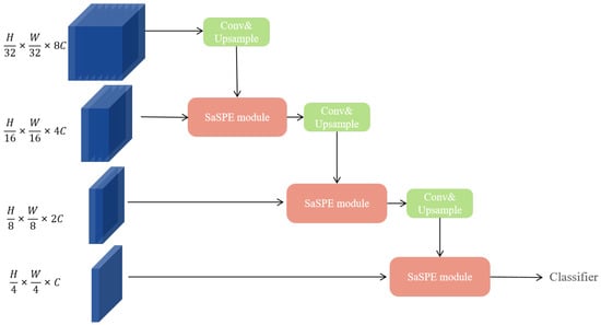 As shown in Figure 6, we design a progressive feature fusion decoder. We progressively reduce and upsample the high-level feature maps using convolutions. The high-level feature map and the second-highest-level feature map are inputted into the SaSPE module to adaptively select the weights of different stages to retain high-level semantic information and detailed information. By analogy, we finally use the classifier to calculate the classification result. The decoder of this structure adds multiscale feature representation while gradually restoring the image size, which is beneficial to land-use classification in RSIs. The decoder is able to fuse feature maps with strong semantic information at low resolution and feature maps with weak semantic information but rich spatial information at high resolution with less computation. The convolution operation sequence mentioned in this decoder structure includes 1 × 1 convolution + BN + ReLU, and the convolution dimensionality reduction and upsampling ratio are both 2 times. We call it progressive feature fusion, abbreviated as the PFF decoder.