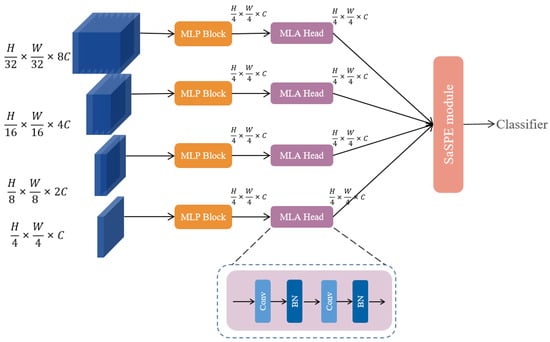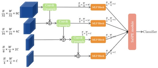 Xie et al. [] first proposed a MLP decoder based on a pure transformer. The MLP decoder upsamples each stage output to the same size. This means that it will directly upsample 8× and 4×. We argue that this may introduce some unwanted noise. Therefore, we designed a progressive MLP feature fusion decoder: the PMLP decoder. In this encoder, we progressively recover the size of the feature map and merge the high-level features with the low-level features to reduce noise introduction. As shown in Figure 7, we reduce the dimensionality of the high-level output, fuse it with the low-level output, and input the result to the MLP block. The output feature maps of the four stages are input into the SaSPE module to obtain multiscale position information attention maps.
