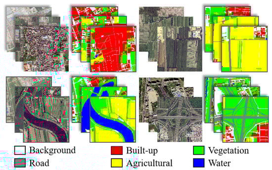 Remote sensing image (RSI) semantic segmentation aims to annotate each pixel to analyze the feature semantics in RSIs []. In real-world applications, RSI semantic segmentation is applied to many scenarios, such as land-use and land-cover (LULC) investigations [], environmental monitoring [], precision agriculture [], urban planning [], and meteorology []. Traditional methods in previous studies have limitations in model complexity in addressing semantic segmentation, which is complicated by nature.