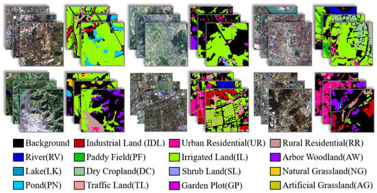 In this paper, we verify the performance of our method on two publicly available LULC datasets: the Beijing land-use (BLU) dataset and the Gaofen image dataset (GID). The BLU and GID datasets can be downloaded at https://rslab.disi.unitn.it/dataset/BLU/ (accessed on 28 April 2023) and https://x-ytong.github.io/project/GID.html (accessed on 28 April 2023), respectively. The BLU dataset has 196 images for training, 28 for validation, and 32 for testing, and each image size is . We manually cropped the GID dataset into a nonoverlapping  tile. Thus, the GID dataset can be divided into 112 for training, 16 for validation, and 32 for testing. The BLU and GID information is shown in Figure 10 and Figure 11. When training the model, the image size of the input model is . We crop each  training image to a  image with a step size of 256. Thus, each  large image yields 49 small images of size . The final images used for model training were 9604 and 5488 on the BLU and GID, respectively.
