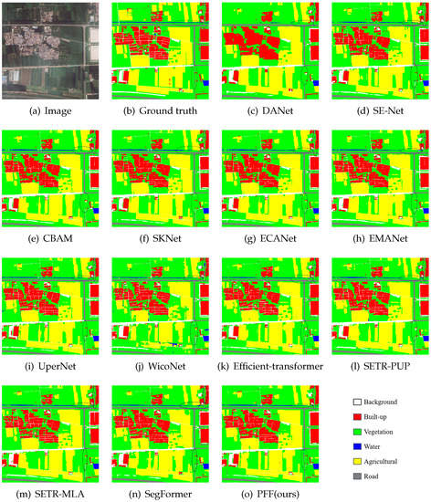 We randomly selected a test set of images for visualization, as shown in Figure 12. Compared with other methods, our method has a significant advantage in identifying slender roads and rivers. The roads and rivers identified by our method are more accurate and coherent.