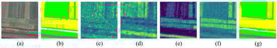 To obtain a deeper understanding of the SaSPE module, we visualized some feature maps of the middle layer, and the visualization results are shown in Figure 14. Observing the original image, there will be differences between the same features and similarities between different features. The feature maps input to the SaSPE module (Figure 14c) differs from feature to feature in an insignificant way, which will cause inaccurate classification. Following the position-aware module (Figure 14d), feature variation between objects can be represented after global position relationship modeling. To minimize the effects of interclass similarity and intraclass differences, we optimize the feature representation space using the semantic-space optimization module after the position-aware module, as shown in Figure 14e. The optimized feature space enhances the similarity of similar features and extends the difference between different features.