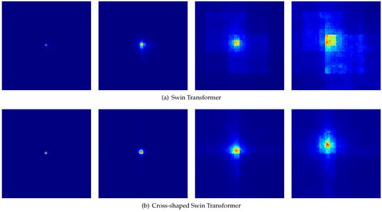 In this section, we visualized the effective receptive fields of the Swin Transformer and cross-shaped Swin Transformer backbone, as shown in Figure 15. We found that while the effective receptive field of the cross-shaped Swin Transformer would be slightly smaller than that of the Swin Transformer in stage 4, it would be larger for the cross-shaped Swin Transformer than for Swin Transformer in the low-level stage. It also shows that, compared with the Swin Transformer, the cross-shaped Swin Transformer has a stronger ability of local modeling. Therefore, the cross-shaped attention approach assists the backbone in achieving high-performance semantic segmentation performance with global modeling capability while enhancing local modeling capability.