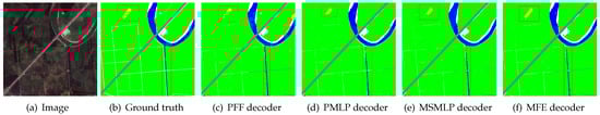 We visualize the results of the four decoders on the BLU dataset for the analysis. The comparison results are shown in Figure 16. We find that the MFE decoder has higher feature recognition integrity than the other decoders, and the PFF decoder will be better than the other decoders in feature continuity recognition. The PMLP and MSMLP decoders have problems with intermittent and incomplete recognition. We argue that the reason is that PMLP and MSMLP are directly upsampling multiples when recovering the image size, which may result in loss of detail information and thus incomplete recognition. While MFE also directly upsamples multiples, the connected MLA module models the features locally, and the SaSPE module can compensate for the lost details when computing the global pixels in the final input multiscale image. It is advantageous to use MLP as a decoder in global modeling, but it is easy to lose the detailed information of the image, so we think that compensating for the lost details by convolution operation will make the transformer-based method more suitable for semantic segmentation of RSIs.