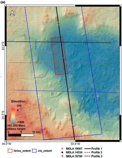 MOLA and Mars orbiter camera (MOC) equipped with MGS has made a major leap forward in mapping Mars. MOC was based on the “pushbroom” technique that acquires data one row at a time along the spacecraft orbits [78]. Thus, the coverage of the wide-angle (WA) camera included the full Martian surface and was able to be controlled by MOLA tracks. The narrow-angle (NA) channels of MOC acquired high-resolution images and revealed detailed geological features of the Martian surface [9]. Moreover, the employment of photogrammetric routines enabled the detailed 3D mapping of interesting geological processes [79,80,81]. Note that this is actually the first case of high-resolution 3D mapping of the surface of a planet other than the Moon. Studies of impact structure and sedimentary processes, polar processes and deposits, volcanism, and other geologic/geomorphic processes benefit from such high-resolution data. The standard error of the control network used for geocoding was known to be only on the order of 5 km. However, it was used as a base map for topographical mapping and MDIM 2.1 was released, which was orthorectified using the MOLA DEM and with better control accuracy [82].