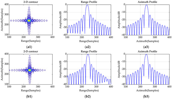 Two-dimensional contour, range profile, and azimuth profile of the focused results. (a1–a3) The results for the point target . (b1–b3) The results of the point target . (c1–c3) The results of point target . The results have been oversampled by a factor of 16 to show more details.